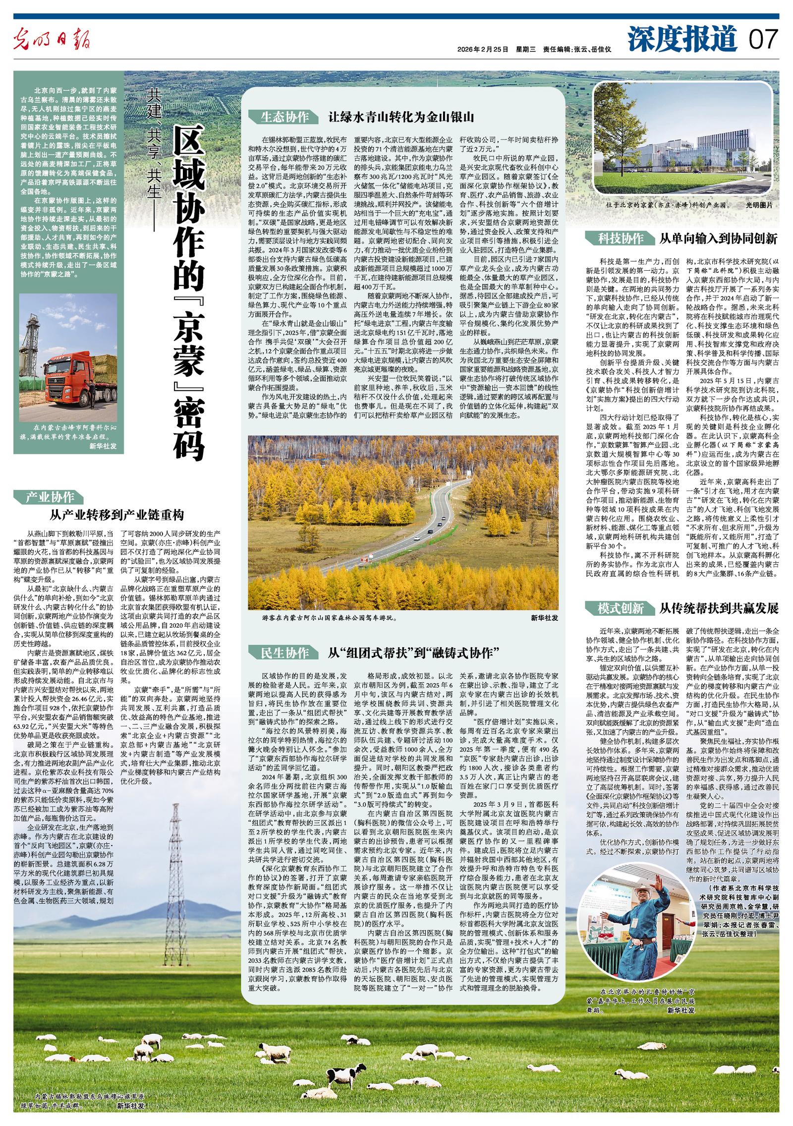 2026年2月25日《光明日?qǐng)?bào)》第7版整版刊發(fā)了《共建、共享、共生——區(qū)域協(xié)作的“京蒙”密碼》的文章,報(bào)道了聚焦民生福祉,夯實(shí)協(xié)作根基。京蒙協(xié)作始終將保障和改善民生作為出發(fā)點(diǎn)和落腳點(diǎn),通過(guò)精準(zhǔn)對(duì)接群眾需求,推動(dòng)優(yōu)質(zhì)資源對(duì)接、共享,努力提升人民的幸福感、獲得感,通過(guò)改善民生凝聚人心。