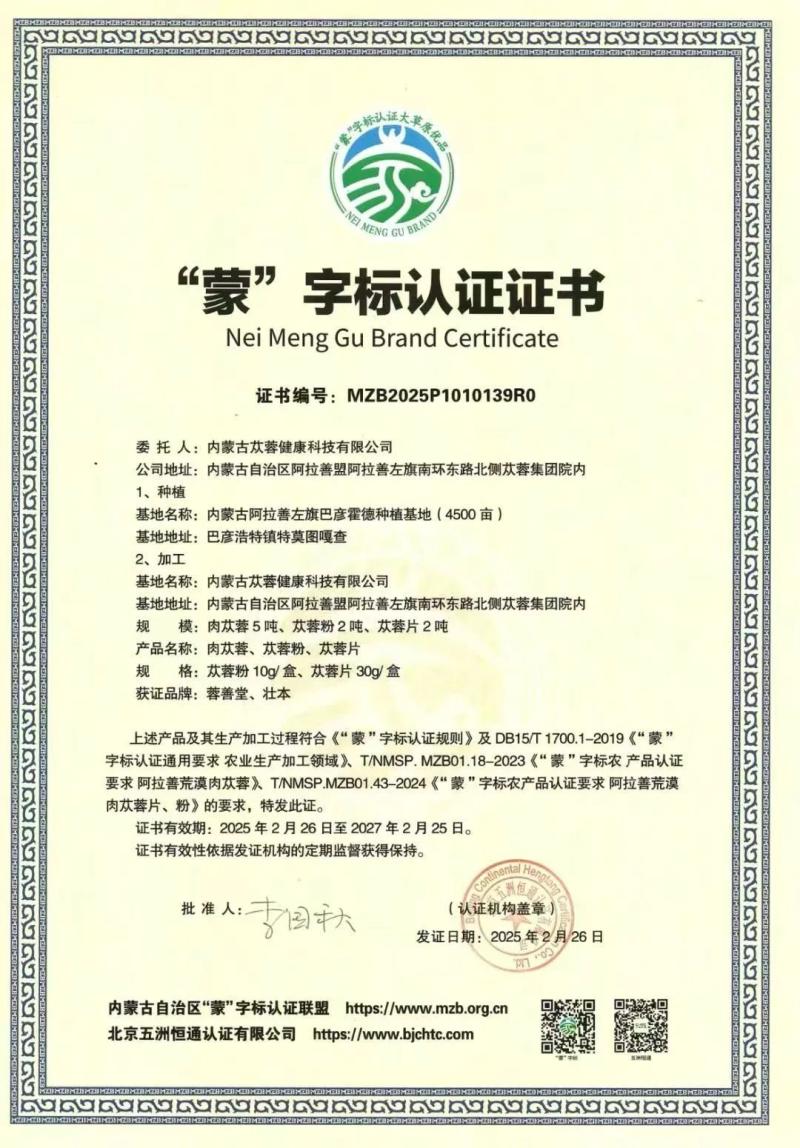 內(nèi)蒙古蓯蓉健康科技有限公司隸屬內(nèi)蒙古阿拉善蓯蓉集團(tuán)有限責(zé)任公司,主要負(fù)責(zé)肉蓯蓉種植基地建設(shè),以及肉蓯蓉食藥同源產(chǎn)品的生產(chǎn)與銷售。目前,公司已建成6萬畝高標(biāo)準(zhǔn)梭梭—肉蓯蓉高產(chǎn)穩(wěn)產(chǎn)示范基地,并獲評國家林下經(jīng)濟(jì)示范基地稱號。公司產(chǎn)品相繼通過有機產(chǎn)品認(rèn)證、中國森林認(rèn)證、生態(tài)原產(chǎn)地保護(hù)產(chǎn)品認(rèn)證、道地藥材認(rèn)證和7S道地保真管理體系認(rèn)證,全方位保障產(chǎn)品的生態(tài)有機特性與全程可追溯性。