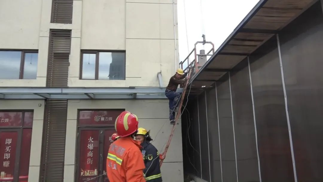 指揮員立即命令第一營救小組前往建筑內(nèi)部,試圖通過住戶窗戶進行營救,當營救小組到達指定位置后發(fā)現(xiàn),消防隊員與被困工人相距太遠,空中營救的危險性和困難程度較高。消防隊員通過與被困工人交流,提醒他抓好繩索,安撫他的情緒。很快,第二組營救的消防隊員利用掛鉤梯爬到二層位置把纏繞的鋼絲繩拉到地面,4人分別拽一根鋼絲繩,松解纏繞的鋼絲繩,使升降機恢復運行。而此時,天氣逐漸放晴,風力也開始減弱,在消防隊員們的努力下,升降機緩緩下降,18時12分,被困的工人安全降落到地面。