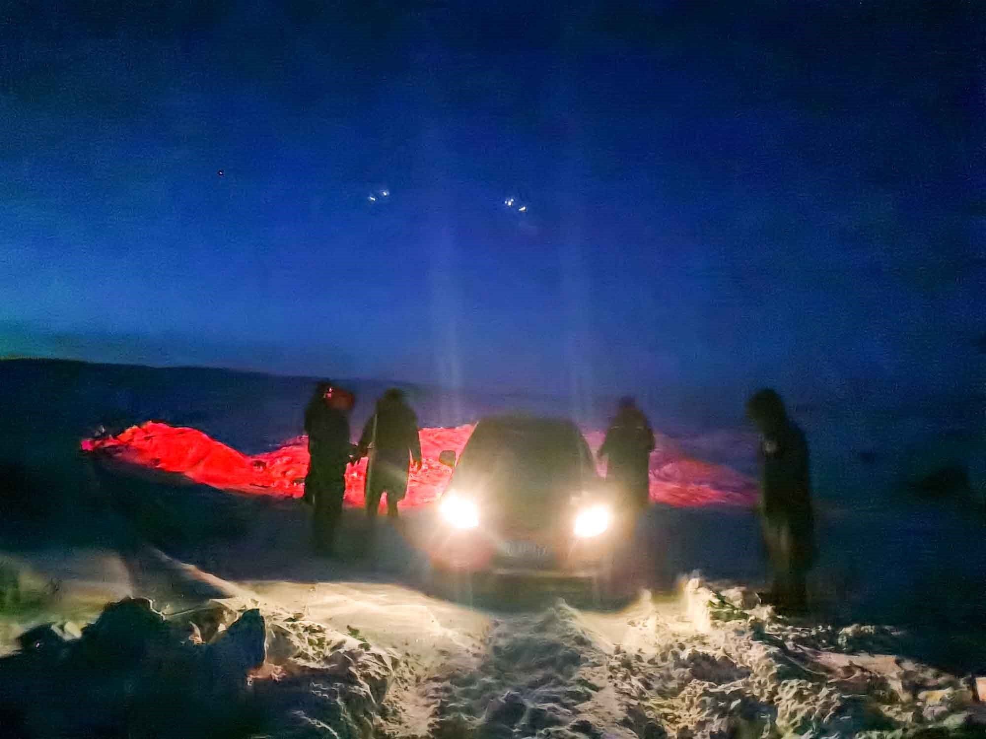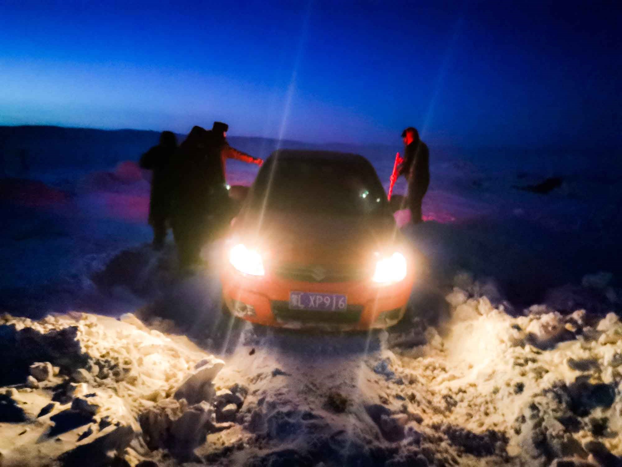 1月17日17時,那木吉拉與弟弟一同駕車返回百靈廟鎮(zhèn),在途經一處被風谷地時,由于晚上視線較差,且此處坡度較大,不慎陷入雪中無法動彈,只得撥通電話請求派出所救助。草原上沒有遮蔽物,常常到了下午就刮起大風,吹得積雪覆蓋在土地上分不清地勢高低,民警們按著平日下鄉(xiāng)走訪的經驗摸索前進,經過近一小時才到達現場,了解情況后,民警們將準備好的熱水和棉大衣遞給牧民便展開了救援工作。在零下35度的冬夜里,民警們用鐵鍬和雙手經過近兩個小時的奮戰(zhàn)終于將40厘米厚的積雪清理干凈,并將被困車輛通過前拉后推的方式移至平坦區(qū)域。