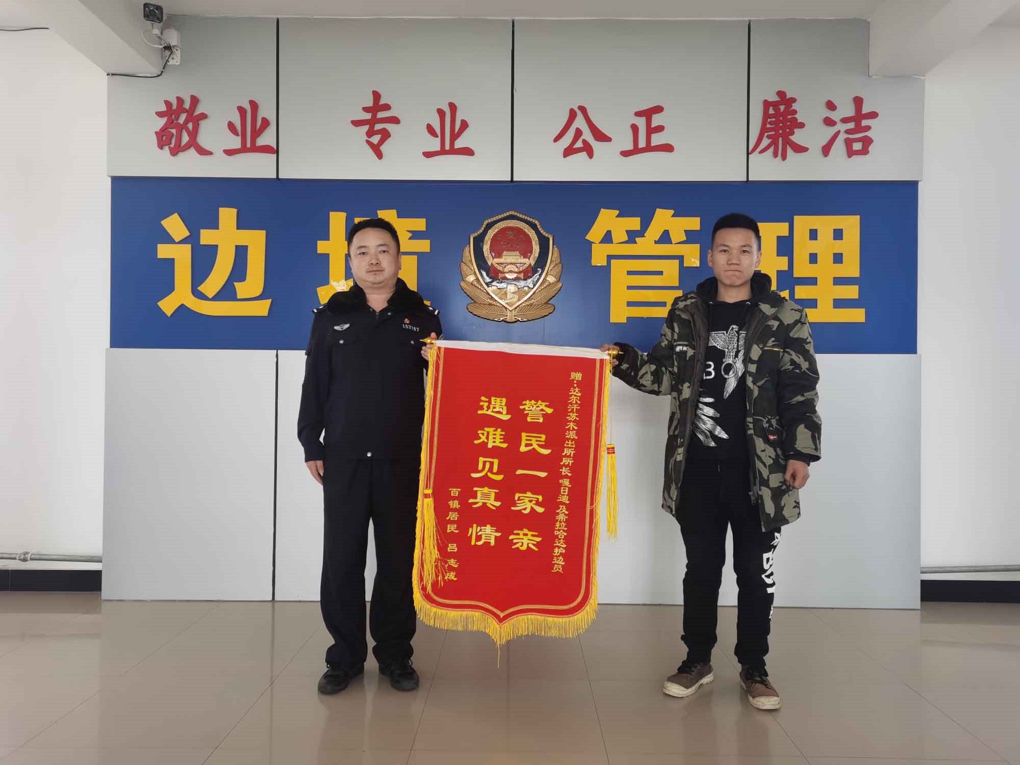 “民警同志太感謝你們了,有你們在我們就感覺安心多了?!?月19日早晨,內蒙古包頭市達茂旗達爾罕蘇木牧民那木吉拉“嘎吱嘎吱”的踩著潔白的積雪走進包頭邊境管理支隊達爾罕邊境派出所,一邊說著一邊拿出印有“警民一家親,遇難見真情”的錦旗遞給民警。