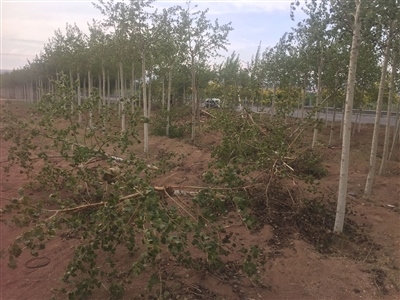 民警趕到現(xiàn)場檢查發(fā)現(xiàn),32棵6年生的河北楊及1棵金葉榆被撞倒,肇事車輛不知所蹤,現(xiàn)場只留下車輛紅色前保險杠殘片和15米長的車輛輪胎痕跡。