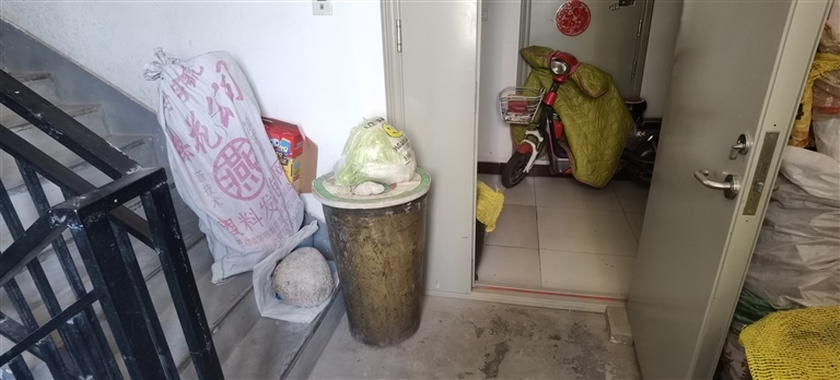 10月18日,記者在嘉和園3號樓1單元看到,有2輛電動車及3輛自行車停放在1樓大廳內(nèi),空間很窄,側身才能通過步梯門。一輛兒童自行車放置在1樓步梯口,車身布滿灰塵,旁邊放著桌子、鐵柜、木板等;2樓沒有樓梯間,較干凈,無雜物堆放現(xiàn)象;記者來到3樓看到,鐵柜、菜甕、裝滿物品的麻袋、石頭等雜物堆積在樓梯口,還有部分雜物直接蔓延到了樓梯臺階旁……