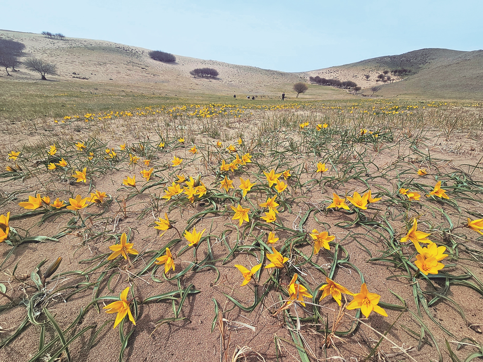 蒙古郁金香是多年生草本植物,僅分布于我國內(nèi)蒙古,由于數(shù)量稀少,被列為國家二級保護(hù)植物。自2023年5月重新發(fā)現(xiàn)郁金香后,保護(hù)區(qū)采取了嚴(yán)格的保護(hù)措施,今年蒙古郁金香分布面積已從最初50畝擴(kuò)展到約100畝,呈現(xiàn)出良好的恢復(fù)態(tài)勢。 (史子龍)