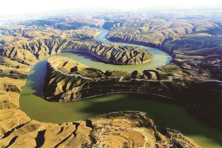 一瀉千里奔騰向前的黃河,在即將告別鄂爾多斯高原之際忽然變得戀戀不舍,繞著準(zhǔn)格爾大峽谷迂回徘徊,留下了兩個接近360度的大轉(zhuǎn)彎。青山不墨,綠水無語,卻肩并肩勾勒出流傳千秋的畫卷——“太極灣”。