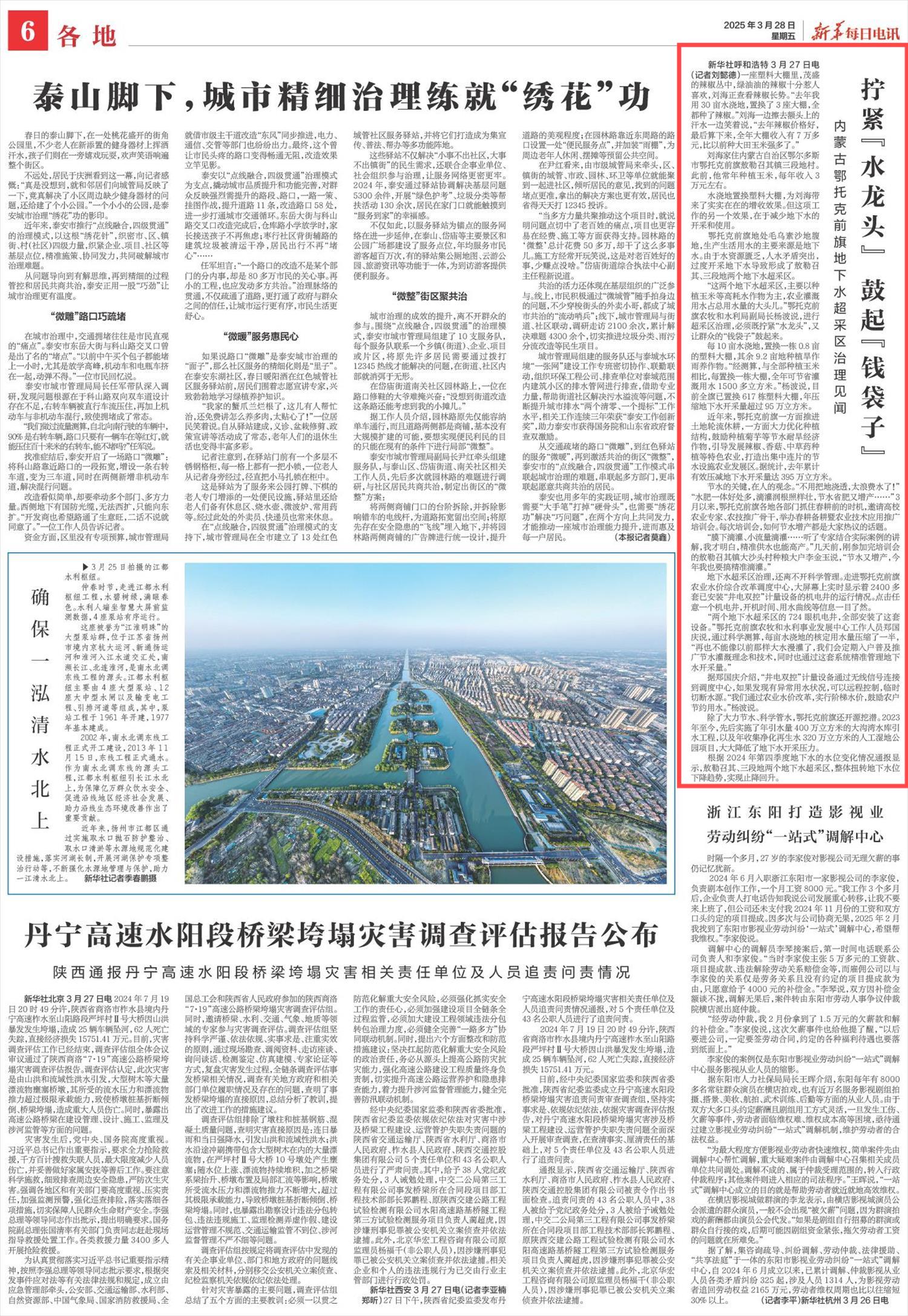 2025年3月28日,《新華每日電訊》第6版刊發(fā)題為《擰緊“水龍頭” 鼓起“錢袋子”》的文章,報(bào)道了內(nèi)蒙古鄂托克前旗通過水澆地置換大棚、推廣節(jié)水作物及滴灌技術(shù),不僅使農(nóng)戶收入增長,還減少了地下水的開采和使用。根據(jù)2024年第四季度地下水的水位變化情況通報(bào)顯示,敖勒召其、三段地兩個(gè)地下水超采區(qū),整體扭轉(zhuǎn)地下水位下降趨勢,實(shí)現(xiàn)止降回升。