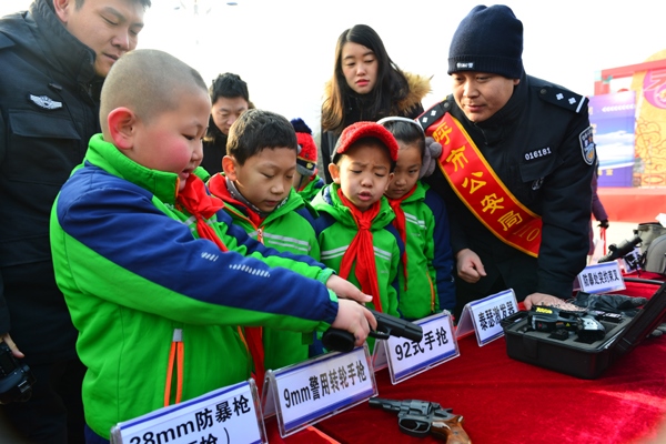 1月10日,民警為小朋友們講解槍支警械。當(dāng)日,是全國第33個“110宣傳日”,呼和浩特市公安局在如意廣場開展了“110宣傳日”活動?,F(xiàn)場,戰(zhàn)鷹突擊隊民警向市民介紹了槍支警械以及常用裝備,四旋翼無人機、定位儀、微光夜視儀等先進設(shè)備?;顒幼屓罕娏憔嚯x接觸了難得一見的特種裝備,搭建起警民互動橋梁,增強市民的安全感。