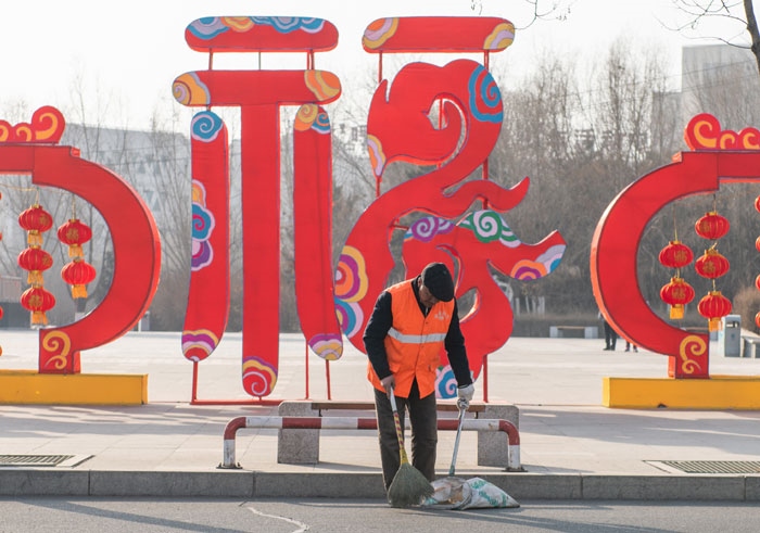 2月5日,正月初一,環(huán)衛(wèi)工人正在清掃街道。春節(jié)期間,呼和浩特市環(huán)衛(wèi)部門(mén)在全市特殊區(qū)域、重點(diǎn)路段、公共廁所等公共設(shè)施重點(diǎn)部位,加大環(huán)衛(wèi)力量投入,讓節(jié)日里的市容市貌更加亮麗。