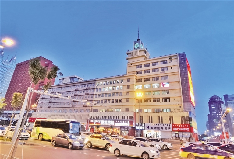 當(dāng)日傍晚時(shí)分,天色漸暗,華燈初上,在斑斕的霓虹燈中,街道車水馬龍,人群熙熙攘攘,一派繁華都市的景象。這座建于1983年的景觀塔鐘,依然和30多年前一樣屹立在新華廣場(chǎng)東側(cè)的信息大廈樓頂,再次以“地標(biāo)”姿態(tài)工作起來(lái)。