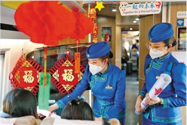 2022年2月15日,在包頭開(kāi)往北京北的G2494次復(fù)興號(hào)列車上,高鐵乘務(wù)員與旅客們一起度過(guò)溫暖又美好的旅程。