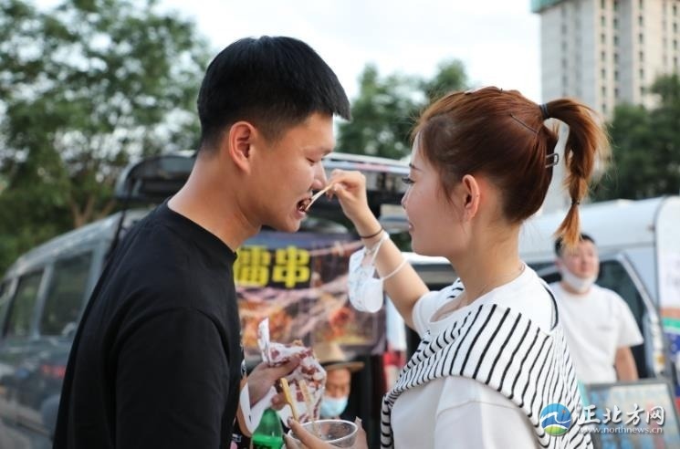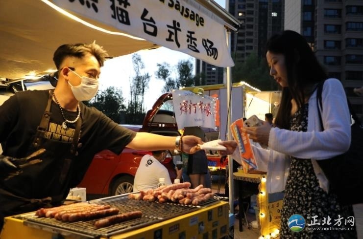 人間煙火氣,最撫凡人心。雖然已是21時許,但是后備廂集市依然人頭攢動,熱鬧非凡,叫賣聲不絕于耳。一家烤腸攤位前,攤主郭浩楠一邊招呼食客,一邊拿著夾子不緊不慢地翻動著烤架上的烤腸,烤好后拿竹簽一穿,伴著滋滋作響的聲音,紅光透亮的烤腸瞬間香氣四溢。“已經(jīng)參加了好幾場了,一晚上能售出近百根烤腸,不過我的初衷不是為了賺錢,就是想把自己鐘情的美食分享給大家?!惫崎f。