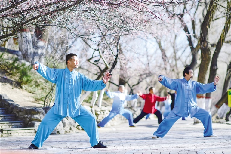 桃花樹(shù)下練太極 4月4日,健身愛(ài)好者在呼和浩特市滿(mǎn)都海公園的桃花樹(shù)下......