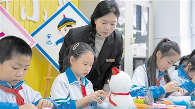 “全國大眾冰雪季給我們帶來了一個絕佳的主題切入點,讓傳統(tǒng)的羊毛氈工藝與冰雪運動相互交融碰撞,孩子們在戳刺羊毛的過程中,對冰雪文化有了更深層次的理解,也對非遺技藝充滿敬意?!苯】到中W美術(shù)教師山丹邊說邊悉心指導學生把握形狀、色彩與紋理,幫助他們將創(chuàng)意更好地在羊毛氈作品中呈現(xiàn)?!拔以谥谱鬟@個滑雪小人的時候,就一直在想自己滑雪時的快樂,每戳一針都很用心,希望能把這份快樂表現(xiàn)在作品里。”四年二班學生宋子祺說。