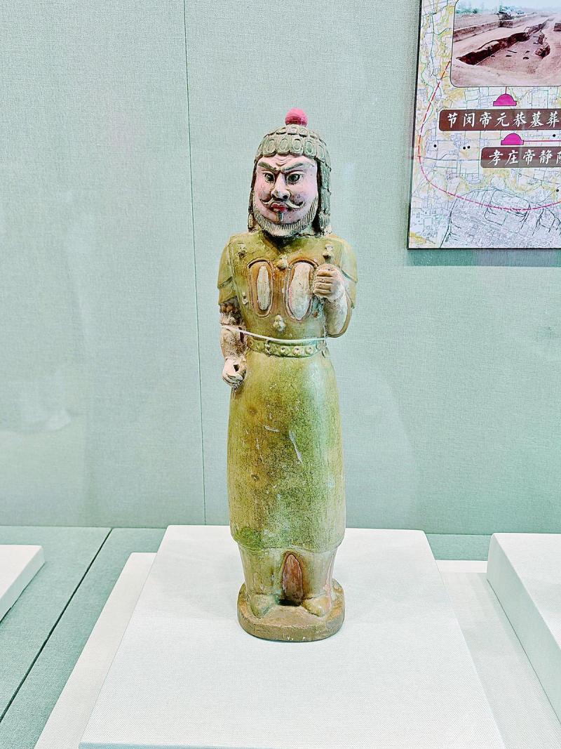 展覽中,呼倫貝爾的嘎仙洞遺址出土的石鏃、骨錐等,見證了拓跋鮮卑早期的生活遺跡;內(nèi)蒙古博物院藏的鹿角金步搖冠精美華麗,鹿頭面部鑲嵌有珠飾,鹿角支叉上所掛的桃形金葉均可搖動(dòng),象征著草原民族對(duì)于鹿的崇拜;釉陶馬、青釉武士俑,展示了拓跋鮮卑強(qiáng)大的騎兵力量;從大同出土的彩繪陶女舞俑到洛陽出土的彩繪陶伎樂俑,體現(xiàn)了北魏在漢化改革前后的服飾變化、音樂舞蹈和社會(huì)生活。