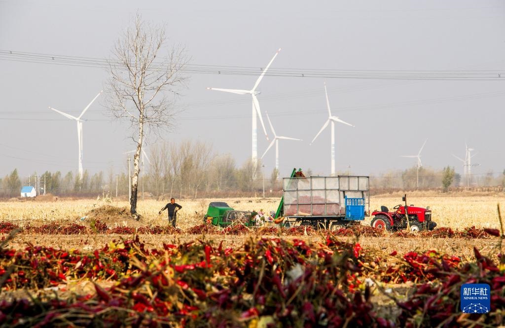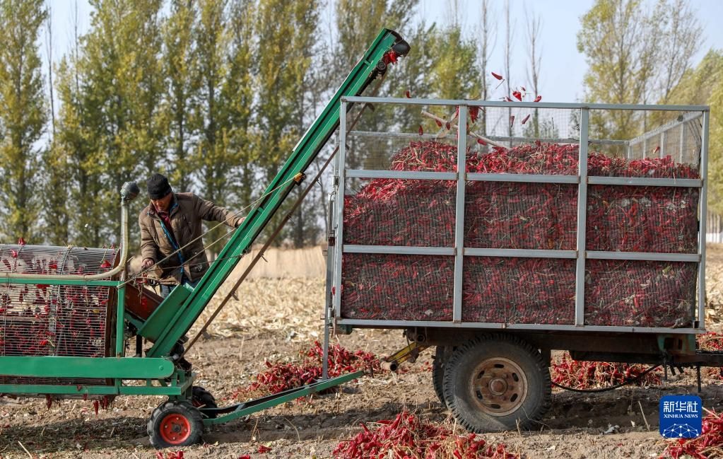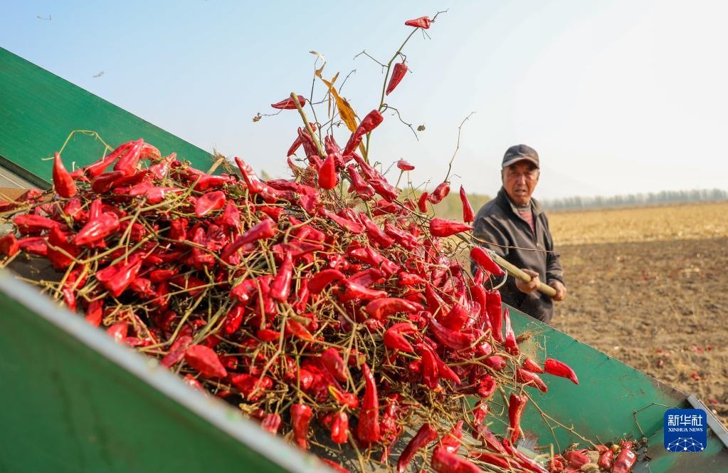 10月25日,在開魯縣東風鎮(zhèn)東方紅村,村民收獲紅干椒。新華社記者 連振 攝