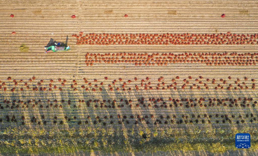 10月25日,在開魯縣東風鎮(zhèn)東方紅村,村民在田間收獲紅干椒(無人機照片)。新華社記者 連振 攝