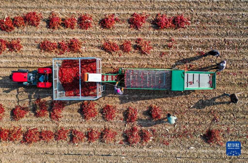 10月25日,在開魯縣東風鎮(zhèn),工作人員駕駛鏟車收獲晾曬好的紅干椒(無人機照片)。新華社記者 連振 攝