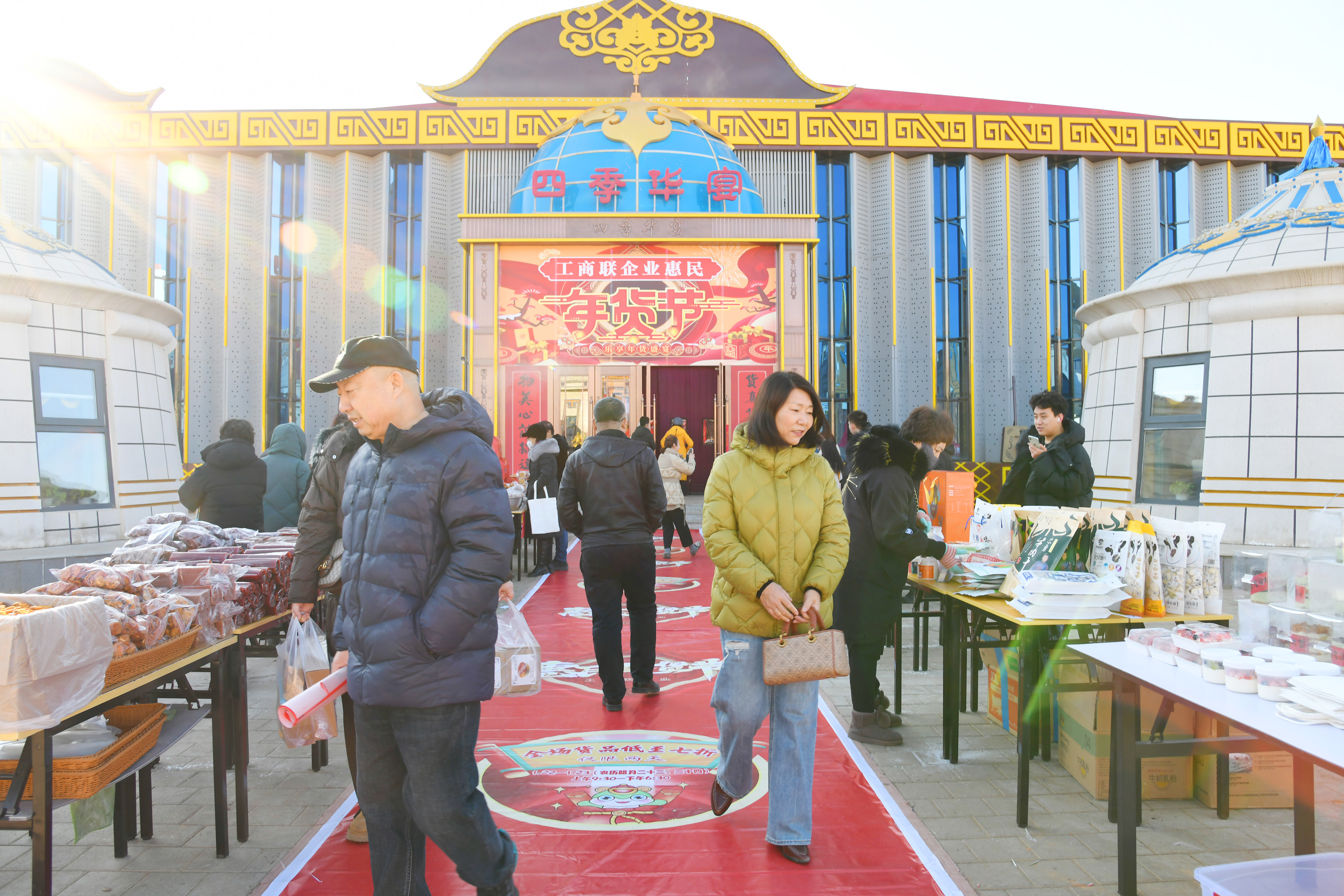 “肘子、熏雞、麻花、糖棗、奶豆腐!”“現(xiàn)出鍋醬牛肉,肥嫩多汁,快來(lái)嘗嘗!”……1月22日,工商聯(lián)惠民年貨節(jié)在集寧區(qū)察哈爾部落?四季華宴火熱開(kāi)市。