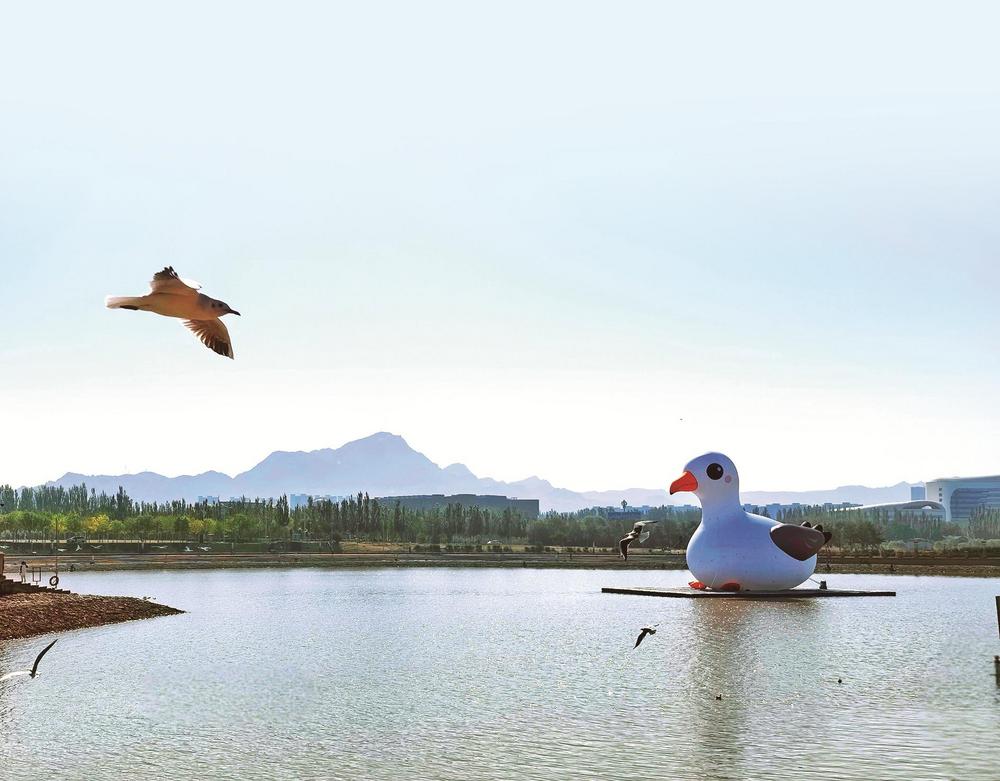站在烏海湖畔旁,看著一片陽光灑在波光粼粼的水面上,泛著細(xì)碎的金光。在這充滿詩意的秋色里,主角“紅嘴鷗”天團(tuán)準(zhǔn)時(shí)赴約。它們穿著“白衣紅鞋”,時(shí)而在波光粼粼的湖面上輕盈滑翔,時(shí)而一個(gè)猛子扎下去,精準(zhǔn)捕獲水中的美味。