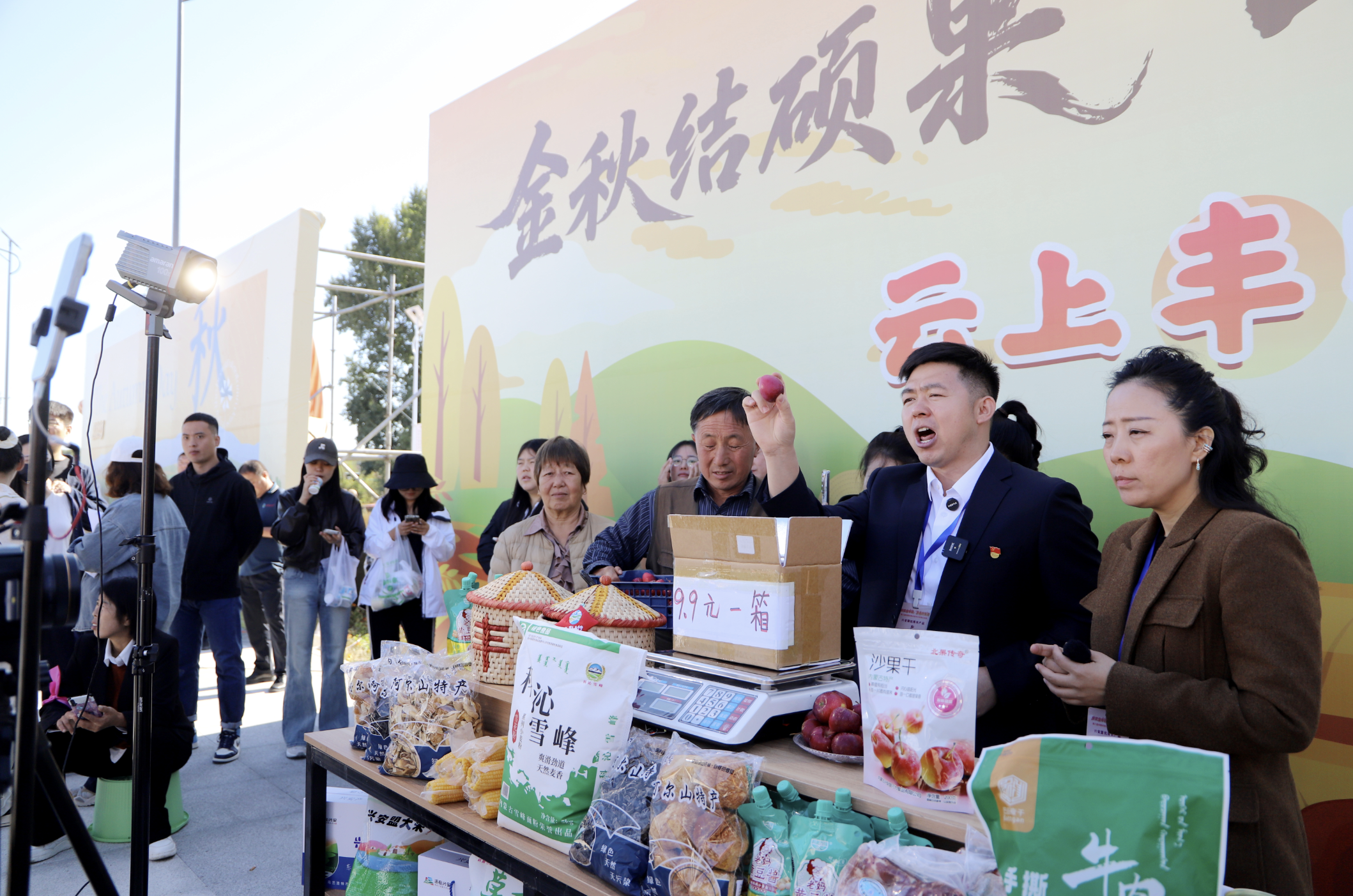 “這都是我們本地的農(nóng)產(chǎn)品,我現(xiàn)在正在豐收節(jié)的現(xiàn)場(chǎng),各位朋友抓緊下單,興安盟產(chǎn)品不會(huì)讓你失望!”活動(dòng)現(xiàn)場(chǎng),烏蘭浩特市義勒力特鎮(zhèn)西包達(dá)力干嘎查駐村干部王曉龍將直播間設(shè)在現(xiàn)場(chǎng),與村民在豐收的熱情氛圍中一起賣力地推介家鄉(xiāng)好物。