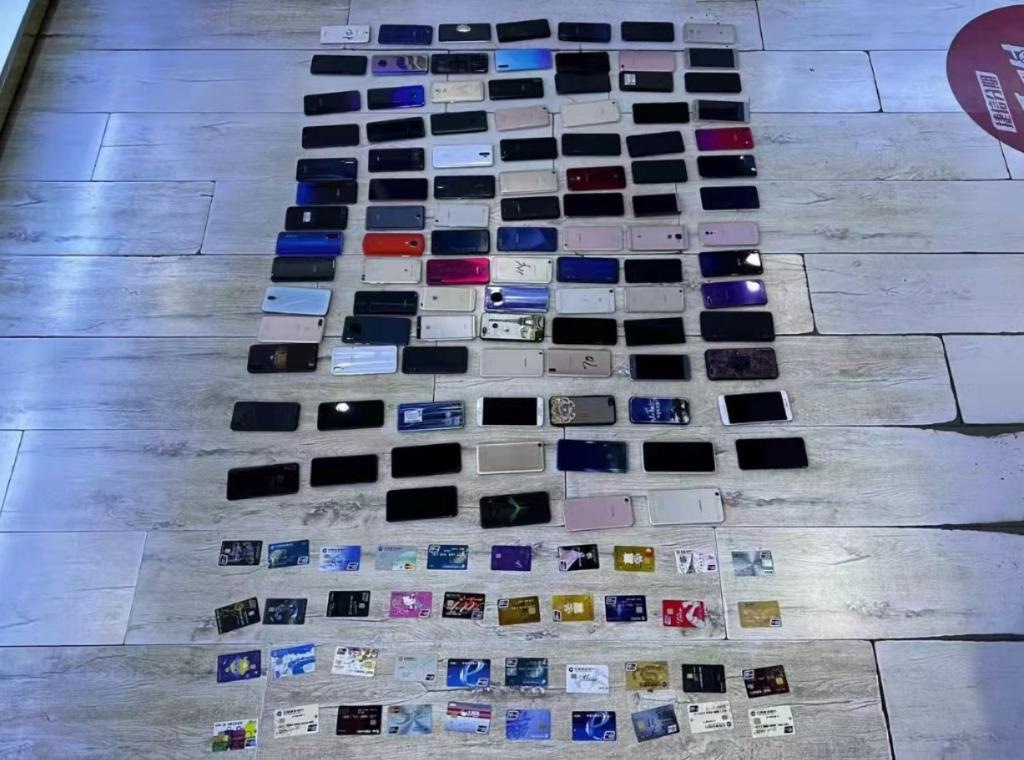 這是民警現(xiàn)場(chǎng)查扣的手機(jī)、銀行卡等部分作案工具。(受訪單位供圖)