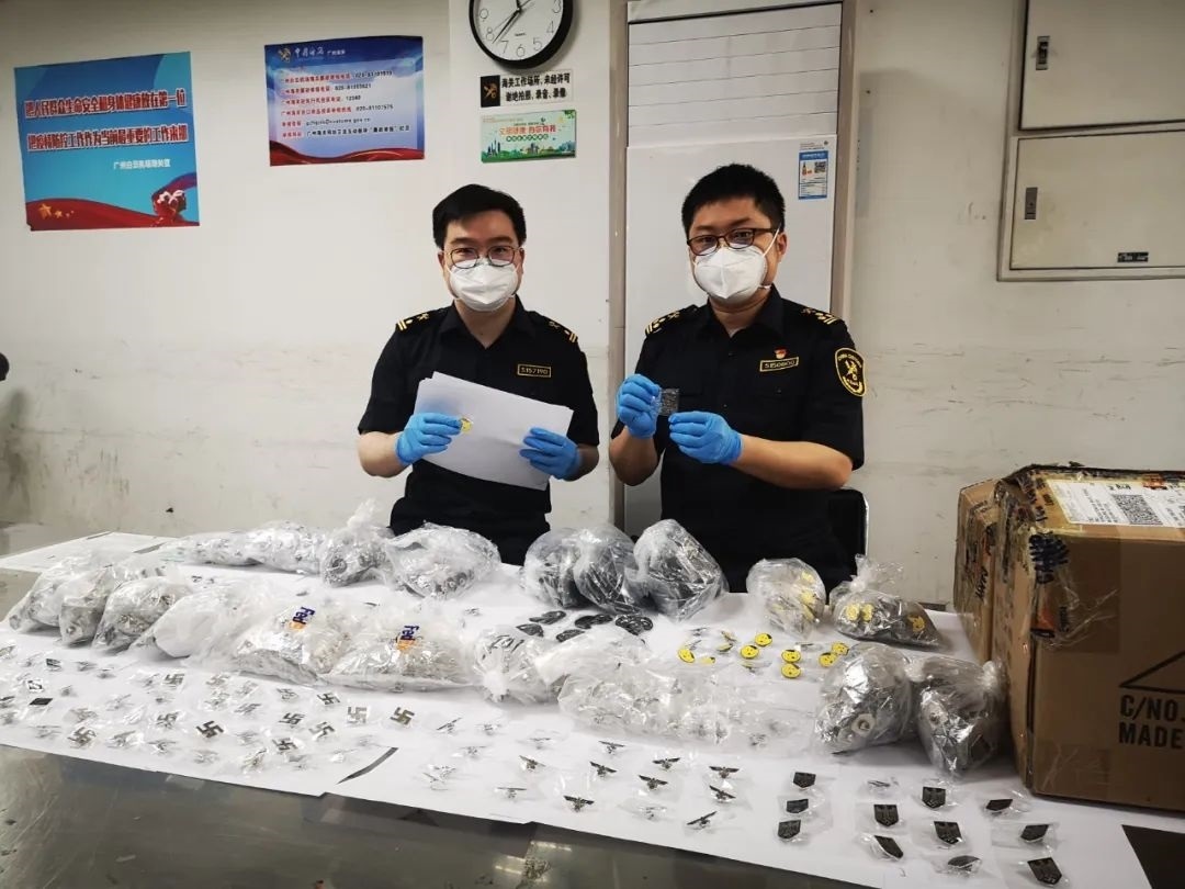 記者5月12日從廣州海關(guān)獲悉,該關(guān)近日在廣州白云機場空港口岸出境快件渠道查獲一批納粹徽章,共9個品種、1881枚。目前,已作進(jìn)一步處理。