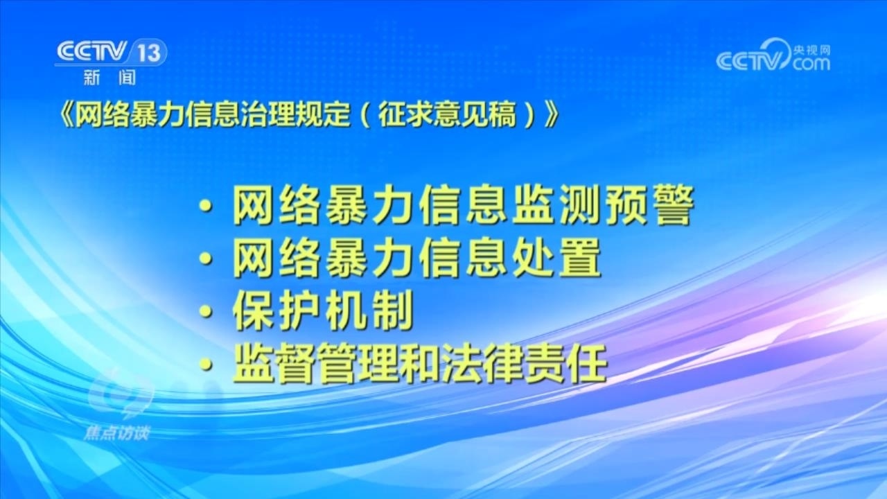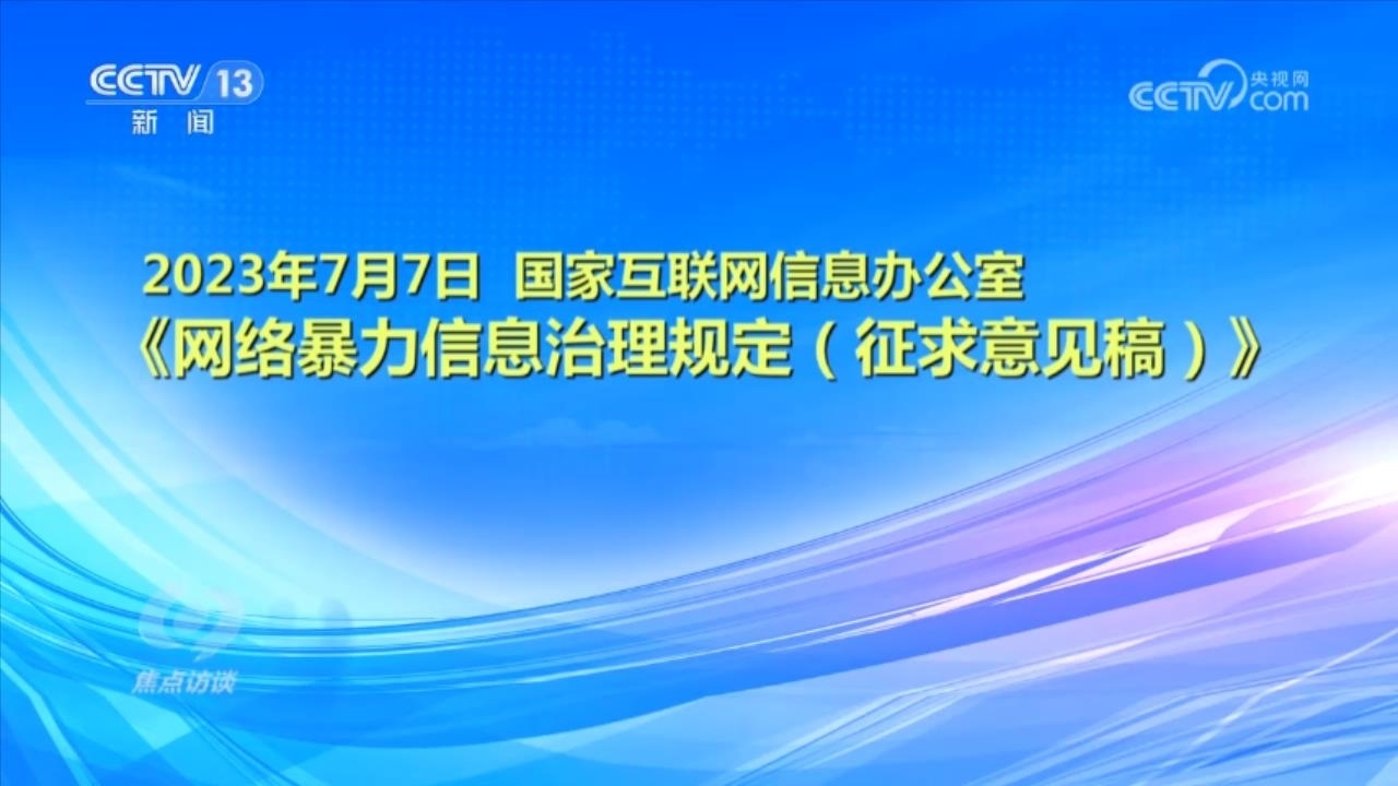 央視網(wǎng)消息(焦點(diǎn)訪談):俗話說“舌上有龍泉,殺人不見血”。網(wǎng)絡(luò)暴力不同于現(xiàn)實(shí)中的拳腳相加,但是這些在網(wǎng)絡(luò)空間中用文字、圖片等方式進(jìn)行的傷害和侮辱,一樣可以對當(dāng)事人的現(xiàn)實(shí)生活產(chǎn)生惡劣的影響,讓當(dāng)事人的心靈“流血”。在傷害當(dāng)事人的同時(shí),網(wǎng)絡(luò)暴力行為也嚴(yán)重污染了互聯(lián)網(wǎng)環(huán)境,影響社會(huì)和諧穩(wěn)定。近日,國家互聯(lián)網(wǎng)信息辦公室起草了《網(wǎng)絡(luò)暴力信息治理規(guī)定(征求意見稿)》,向社會(huì)公開征求意見;同樣是針對網(wǎng)絡(luò)暴力,在6月,最高人民法院、最高人民檢察院、公安部起草了《關(guān)于依法懲治網(wǎng)絡(luò)暴力違法犯罪的指導(dǎo)意見(征求意見稿)》,面向社會(huì)公開征求意見。治理網(wǎng)絡(luò)暴力這顆“毒瘤”,營造良好生態(tài)勢在必行。