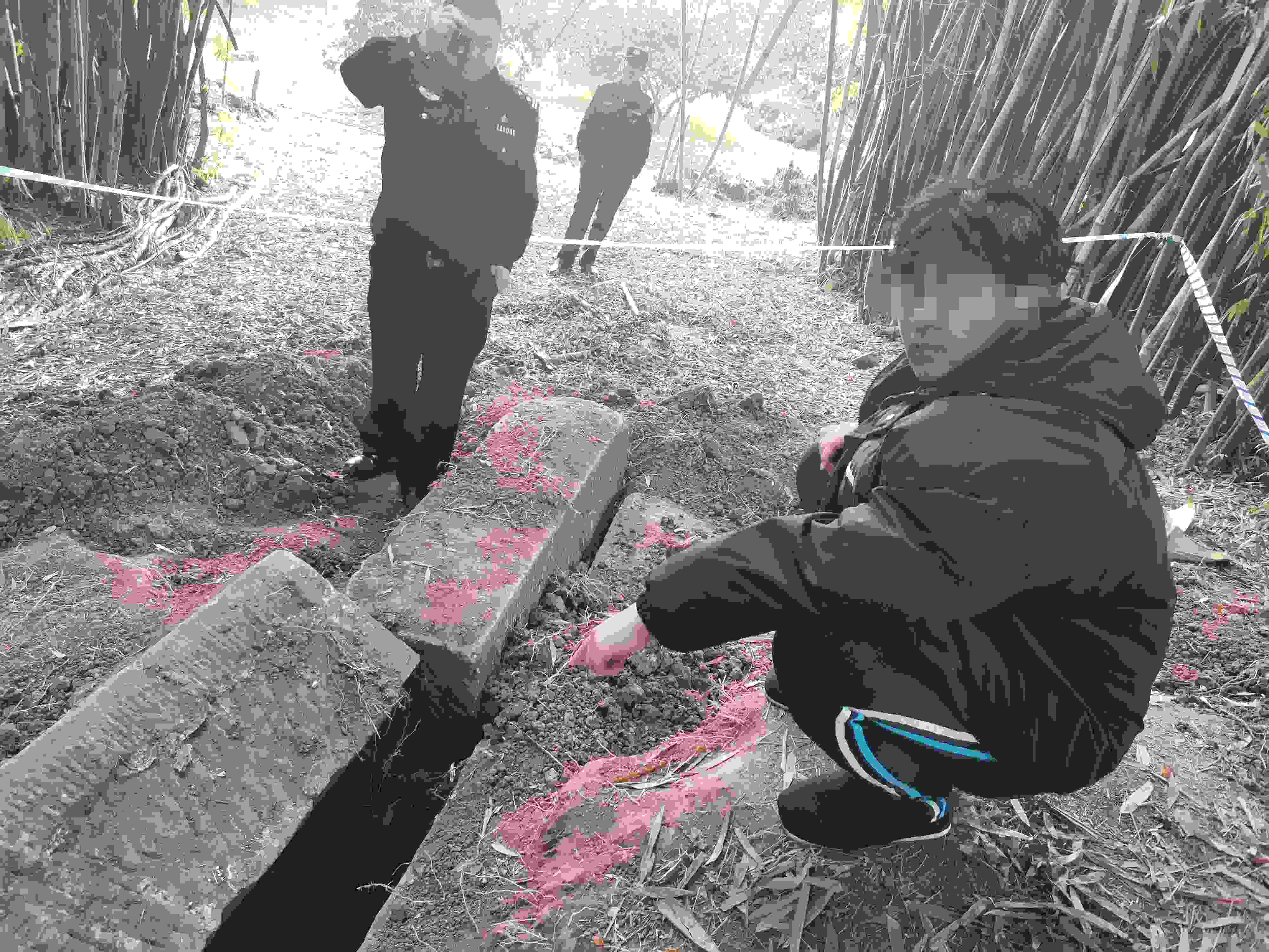 韓某家族的這座祖墳地處一片竹林中,離最近的房屋直線(xiàn)距離不足20米。為此,他趕到現(xiàn)場(chǎng)發(fā)現(xiàn),墓室上的土有多處被挖痕跡,但墓門(mén)上的石頭還沒(méi)被打開(kāi)?!斑@個(gè)地方是條大路,白天也沒(méi)人看到有人來(lái)過(guò)?!表n某懷疑有人盯上了他家的祖墳,想要盜墓,并判斷那些人還會(huì)再來(lái)。