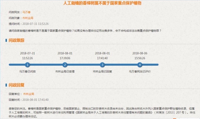 2018年7月,馬萬春通過網(wǎng)絡問政,得到的瀘州市林業(yè)局的答復。圖片來源/受訪者供圖