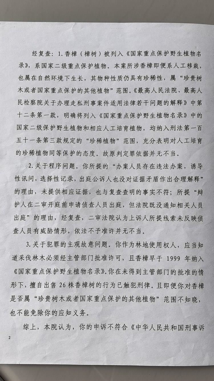 此后,馬萬林向四川省高級人民法院申訴。2019年6月,四川省高院復查認為,本案所涉香樟即便系人工移栽,也屬在自然環(huán)境下生長,其物種性質(zhì)仍具有珍稀性,屬“珍貴樹木或者國家重點保護的其他植物范圍”,“原判定罪證據(jù)并無不當”。