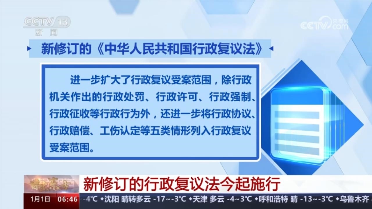 新修訂《中華人民共和國行政復(fù)議法》1月1日起施行,法律進一步擴大了行政復(fù)議受案范圍,除行政機關(guān)作出的行政處罰、行政許可、行政強制、行政征收等行政行為外,還進一步將行政協(xié)議、行政賠償、工傷認定等五類情形列入行政復(fù)議受案范圍。