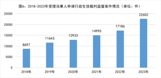 1.依申請(qǐng)監(jiān)督的行政生效裁判監(jiān)督案件數(shù)量逐年上升,反映出人民群眾對(duì)檢察監(jiān)督的更高需求。2018年以來當(dāng)事人不服法院生效裁判向檢察機(jī)關(guān)申請(qǐng)監(jiān)督的案件分別是:2018年8697件、2019年11643件、2020年12933件、2021年14995件、2022年17186件、2023年22602件,年均增加21%。2023年16個(gè)省級(jí)檢察院受理行政案件數(shù)超過民事案件。當(dāng)事人對(duì)裁判結(jié)果申請(qǐng)監(jiān)督的同時(shí),很多情況下還對(duì)審判和執(zhí)行程序一并主張?jiān)V求,追求“看得見”的公平正義。
