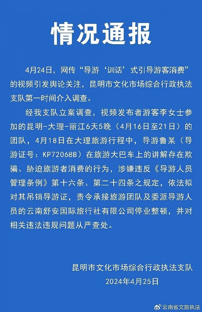 央視網(wǎng)消息:4月25日,昆明市文化市場(chǎng)綜合行政執(zhí)法支隊(duì)通報(bào),4月24日,網(wǎng)傳“導(dǎo)游‘訓(xùn)話’式引導(dǎo)游客消費(fèi)”的視頻引發(fā)輿論關(guān)注,昆明市文化市場(chǎng)綜合行政執(zhí)法支隊(duì)第一時(shí)間介入調(diào)查。經(jīng)支隊(duì)立案調(diào)查,視頻發(fā)布者游客李女士參加的昆明-大理-麗江6天5晚(4月16日至21日)的團(tuán)隊(duì),4月18日在大理旅游行程中,導(dǎo)游魯某在旅游大巴車上的講解存在欺騙、脅迫旅游者消費(fèi)的行為,涉嫌違反《導(dǎo)游人員管理?xiàng)l例》第十六條、第二十四條之規(guī)定,依法擬對(duì)其吊銷導(dǎo)游證,責(zé)令承接旅游團(tuán)隊(duì)及委派導(dǎo)游人員的云南舒安國際旅行社有限公司停業(yè)整頓,并對(duì)相關(guān)違法違規(guī)問題從嚴(yán)查處。