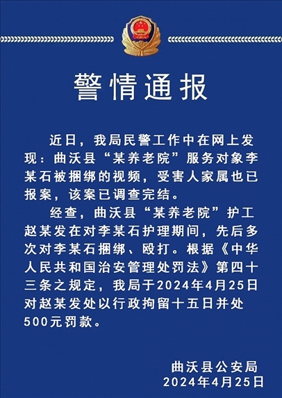 經(jīng)查,曲沃縣“某養(yǎng)老院”護(hù)工趙某發(fā)在對(duì)李某石護(hù)理期間,先后多次對(duì)李某石捆綁、毆打。根據(jù)《中華人民共和國(guó)治安管理處罰法》第四十三條之規(guī)定,曲沃縣公安局于2024年4月25日對(duì)趙某發(fā)處以行政拘留十五日并處500元罰款。