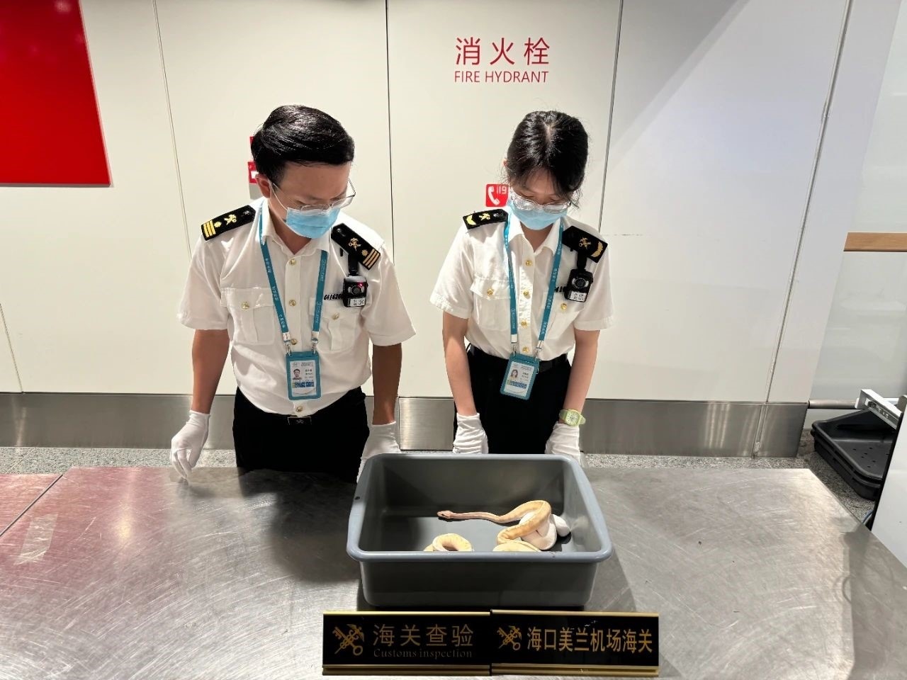 央視網(wǎng)消息:據(jù)“海關發(fā)布”公眾號消息,近日,海口海關所屬??诿捞m機場海關在監(jiān)管入境客運航班時,現(xiàn)場關員通過先期機檢發(fā)現(xiàn)1件托運行李圖像存在異常。攜帶該件行李的旅客通關時選擇無申報通道,未向海關申報任何物品。經現(xiàn)場關員開箱查驗,在其行李物品內查獲4個裝有活物的白色布袋,拆開后發(fā)現(xiàn)每只布袋中均包裹有活體蛇類1條,共計4條。經鑒定,這4條活體蛇為球蟒,屬于《瀕危野生動植物種國際貿易公約》(CITES)附錄Ⅱ列明物種。