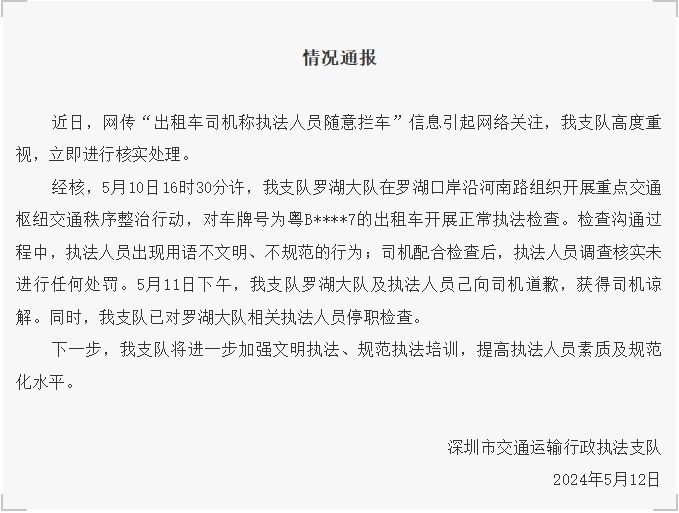 經(jīng)核,5月10日16時(shí)30分許,深圳市交通運(yùn)輸行政執(zhí)法支隊(duì)羅湖大隊(duì)在羅湖口岸沿河南路組織開(kāi)展重點(diǎn)交通樞紐交通秩序整治行動(dòng),對(duì)車牌號(hào)為粵B****7的出租車開(kāi)展正常執(zhí)法檢查。檢查溝通過(guò)程中,執(zhí)法人員出現(xiàn)用語(yǔ)不文明、不規(guī)范的行為;司機(jī)配合檢查后,執(zhí)法人員調(diào)查核實(shí)未進(jìn)行任何處罰。5月11日下午,深圳市交通運(yùn)輸行政執(zhí)法支隊(duì)羅湖大隊(duì)及執(zhí)法人員己向司機(jī)道歉,獲得司機(jī)諒解。同時(shí),深圳市交通運(yùn)輸行政執(zhí)法支隊(duì)已對(duì)羅湖大隊(duì)相關(guān)執(zhí)法人員停職檢查。