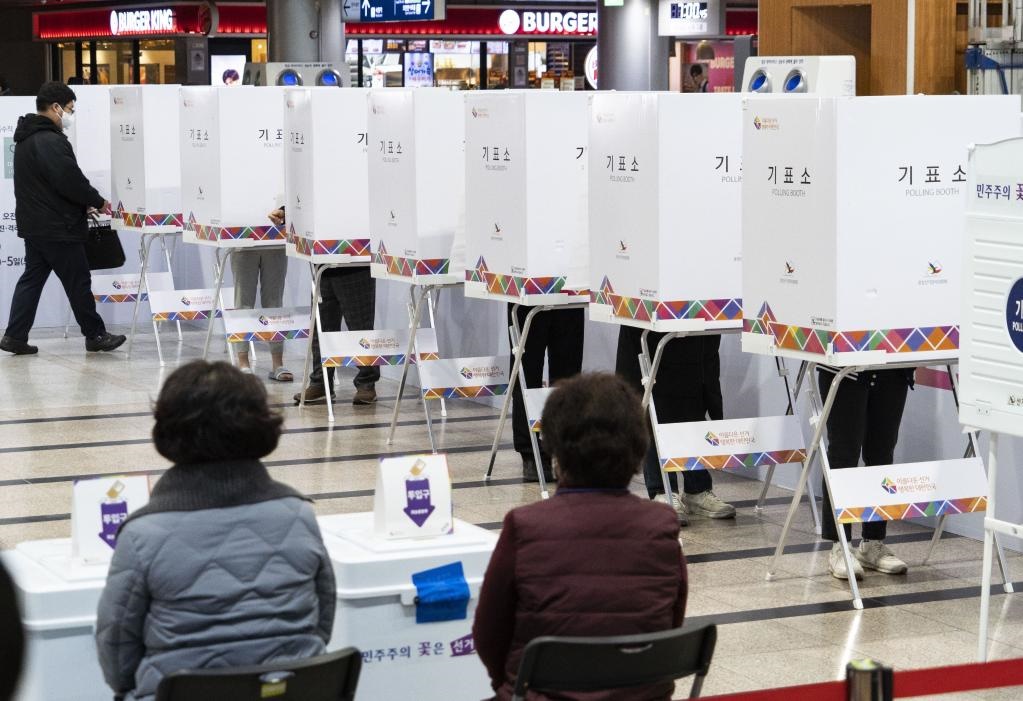 3月4日,選民在韓國(guó)首爾一個(gè)投票站填寫(xiě)選票。(新華社發(fā),李相浩攝)