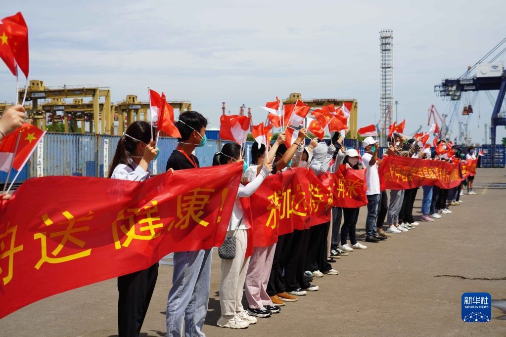 11月18日,在印度尼西亞首都雅加達(dá)的丹戎不碌港,送行人員向中國(guó)海軍“和平方舟”號(hào)醫(yī)院船揮手告別。新華社發(fā)(孫飛 攝)