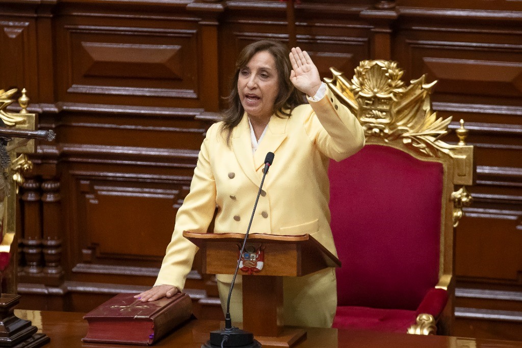 2022年12月7日,在秘魯利馬,迪娜·博盧阿特在國會宣誓就任總統(tǒng)。新華社發(fā)(瑪利亞娜·巴索攝)
