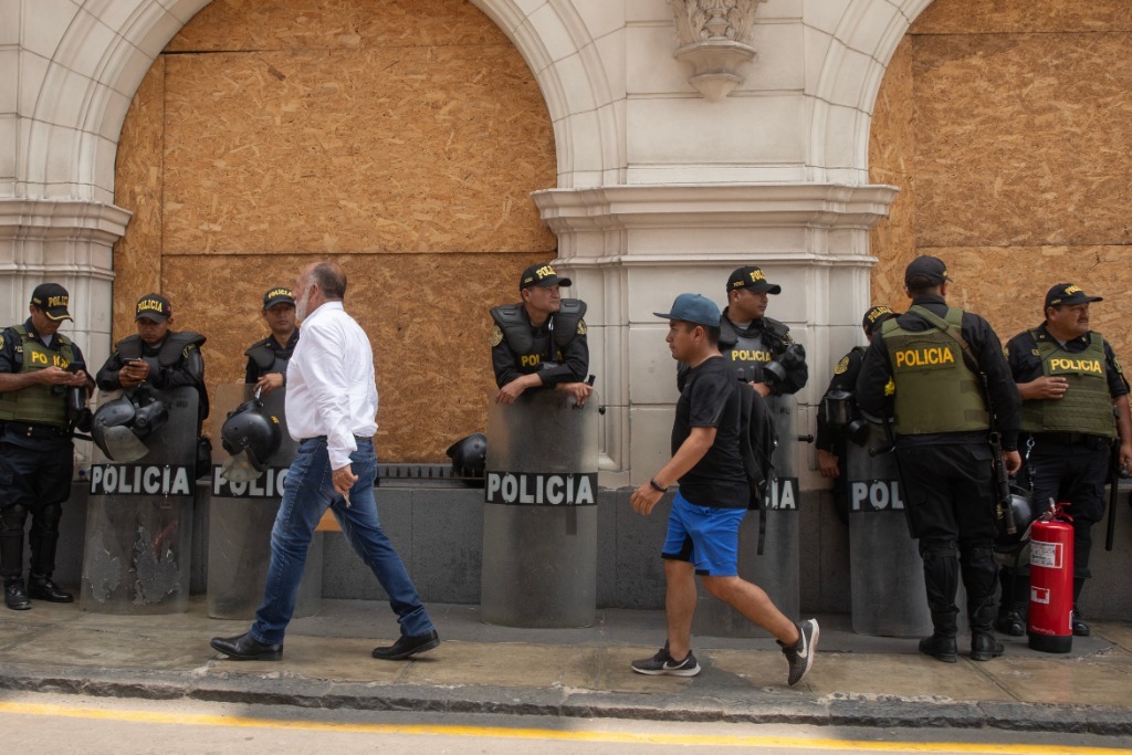 2022年12月14日,警察在秘魯首都利馬市中心執(zhí)勤。新華社發(fā)(瑪利亞娜·巴索攝)