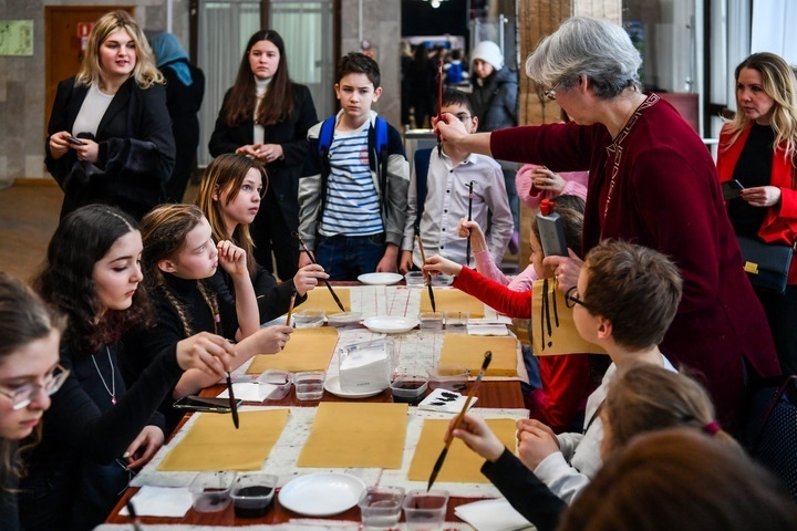 3月3日,在莫斯科國(guó)際關(guān)系學(xué)院,小朋友們?cè)谥袊?guó)文化體驗(yàn)活動(dòng)上學(xué)習(xí)使用毛筆。新華社記者曹陽攝