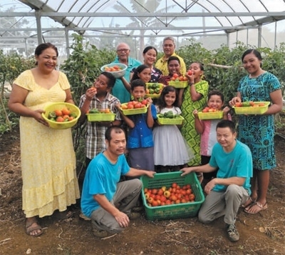 湯加農(nóng)戶拉姆齊一家和中方技術人員一起展示大棚里采摘的蔬菜。本報記者 陳效衛(wèi)攝