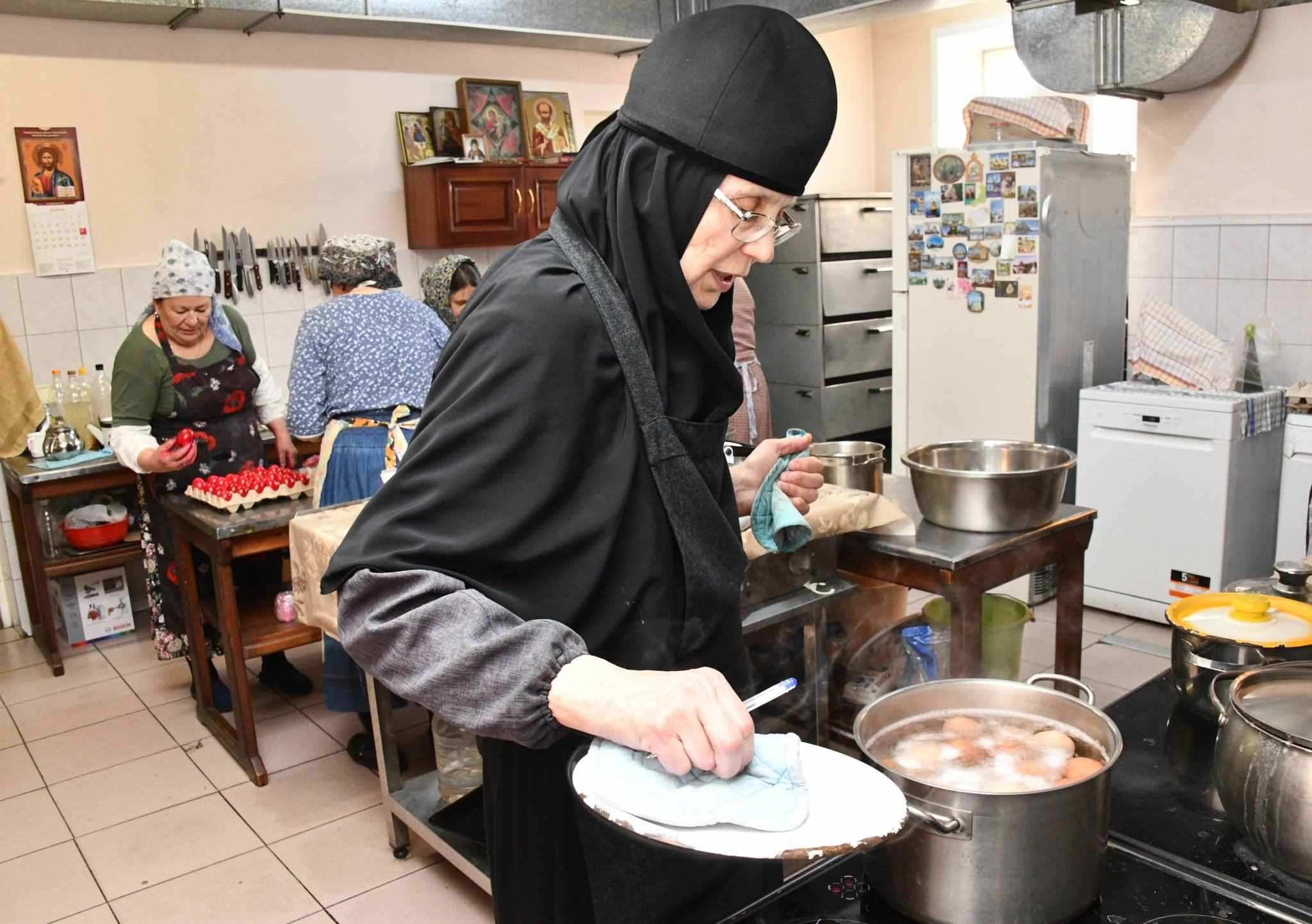 當?shù)貢r間2023年4月13日,俄羅斯扎貝卡爾斯基地區(qū),阿塔馬諾夫卡定居點的一修道院內(nèi),民眾在制作東正教復活節(jié)前的傳統(tǒng)煮雞蛋。視覺中國
