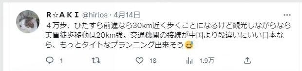 “4萬步,直線距離相當(dāng)于將近30公里,不過如果是徒步邊走邊逛景點(diǎn),差不多是20來公里。如果在公共交通更便利的日本,應(yīng)該能壓縮出一個更緊湊的行程?!?/p>