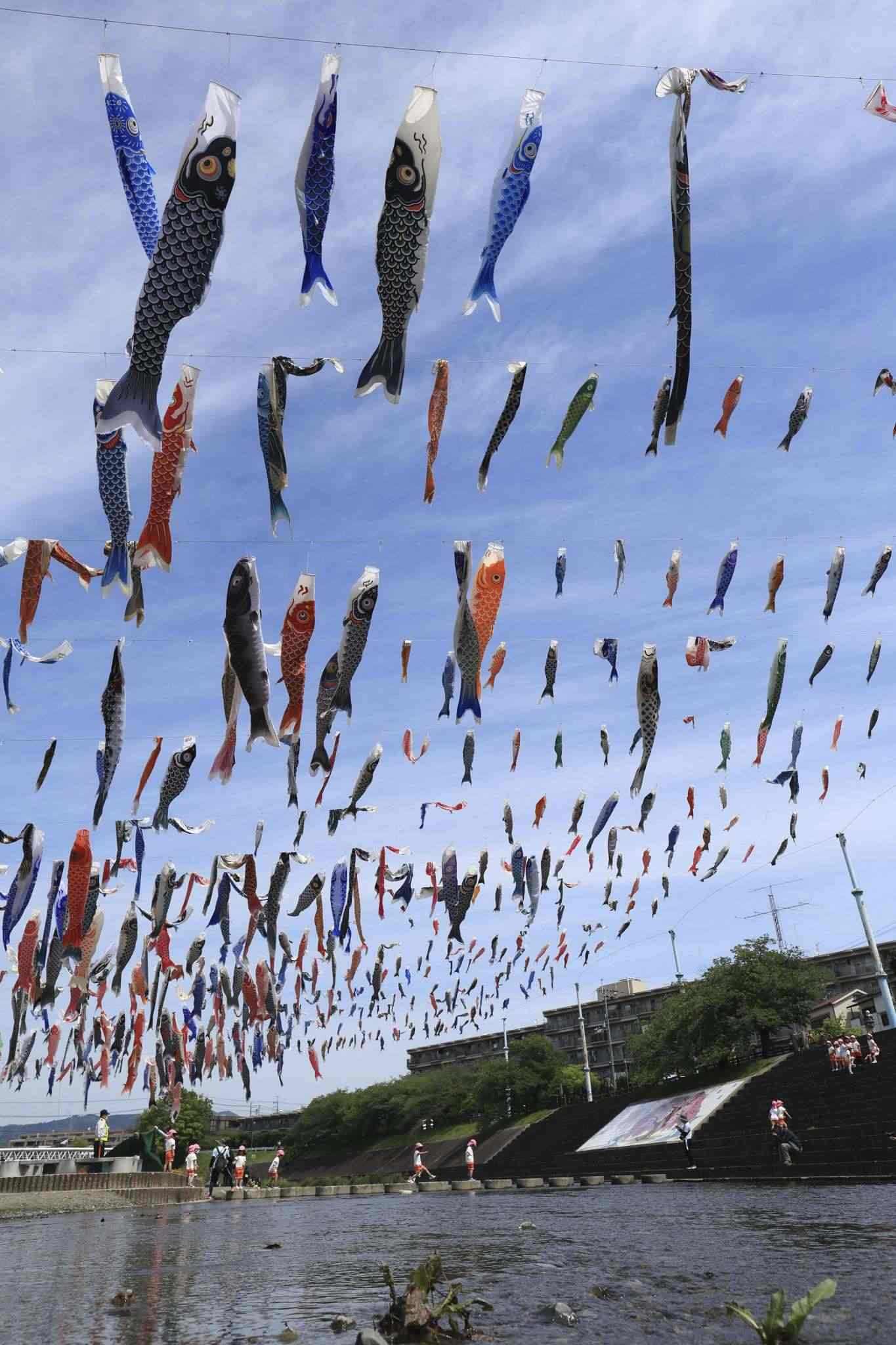 當(dāng)?shù)貢r間2023年4月28日,日本大阪,大約1000條鯉魚旗在高摫市的秋田川河上空飄揚(yáng),慶祝5月5日兒童節(jié)。視覺中國