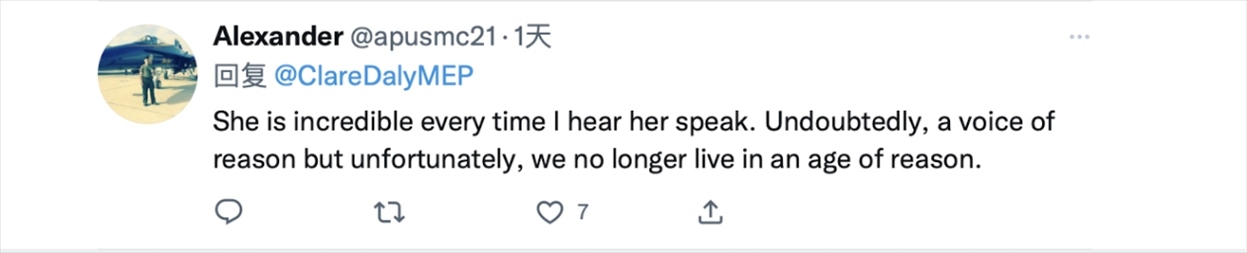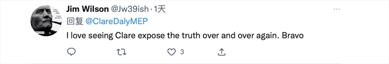 克萊爾·戴利的推文正是她在歐洲議會(huì)發(fā)言中所提到的內(nèi)容。在視頻中,克萊爾·戴利首先抨擊了西方對(duì)華問題上的雙標(biāo)行為。她在發(fā)言時(shí)稱,“人們?cè)诒┞斗至训耐瑫r(shí)談?wù)撝鴪F(tuán)結(jié),他們一邊在歐盟向?yàn)蹩颂m提供武器,一邊與中國(guó)談?wù)摵推?。他們哀嘆中國(guó)在臺(tái)灣地區(qū)‘挑釁’,但對(duì)美國(guó)干涉國(guó)際公認(rèn)的中國(guó)領(lǐng)土卻只字未提。”