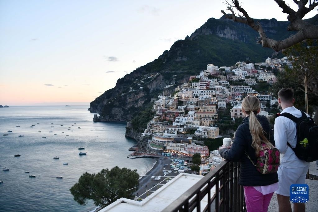 5月3日,游客欣賞落日余暉下的意大利阿馬爾菲海岸線。