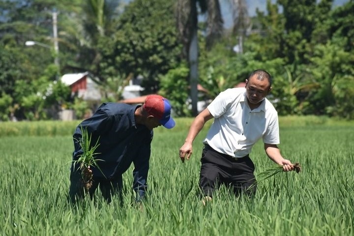 4月26日,在多米尼加首都圣多明各西北約80公里處,中國農(nóng)業(yè)專家(右)和當?shù)剞r(nóng)民在多米尼加國家水稻培訓中心的一片試驗田內(nèi)工作。新華社記者 朱婉君 攝