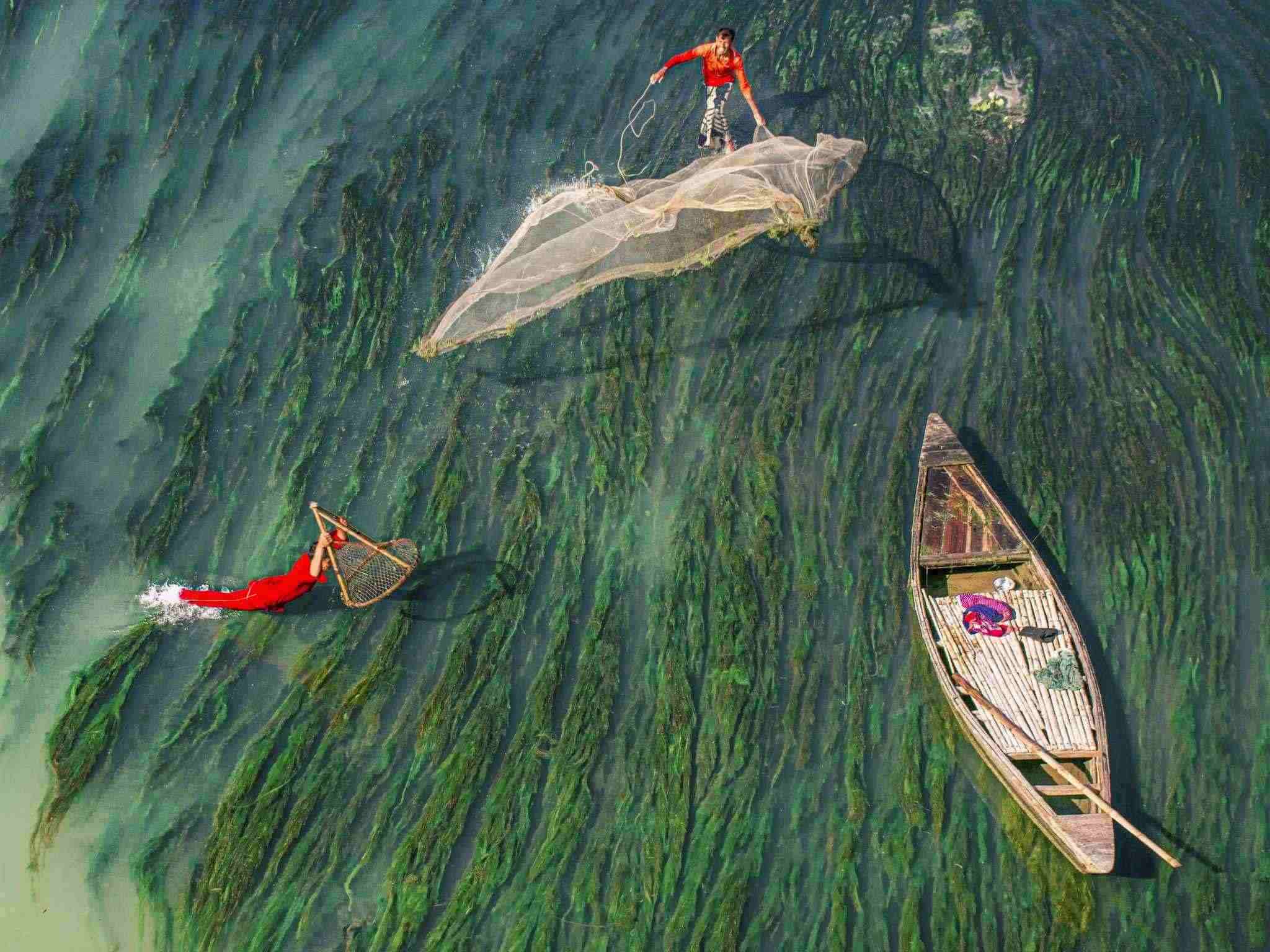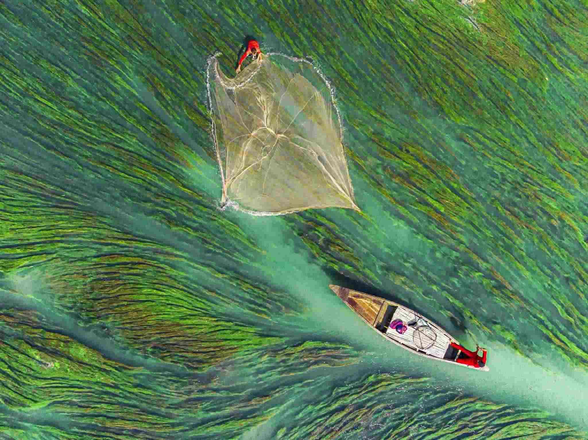 孟加拉拉杰沙希,漁民在河中撒網(wǎng)捕魚(yú),周?chē)欢嗖实乃灏鼑?。視覺(jué)中國(guó)