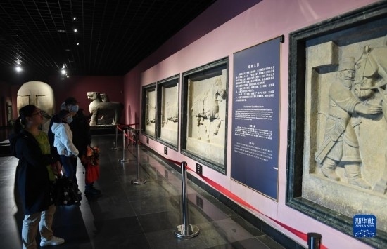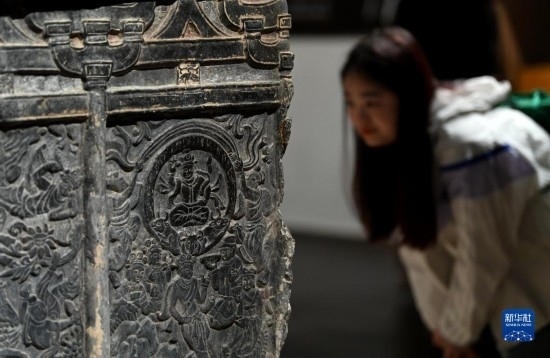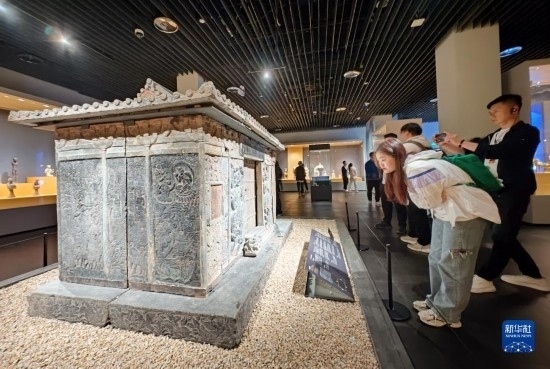 5月8日,游客在西安博物院參觀史君墓石槨。墓主史君是北周涼州薩保,粟特人。石槨整體為中國傳統(tǒng)歇山頂?shù)钐檬浇ㄖ谋诟〉駜?nèi)容和風(fēng)格則帶有鮮明的西域特色。